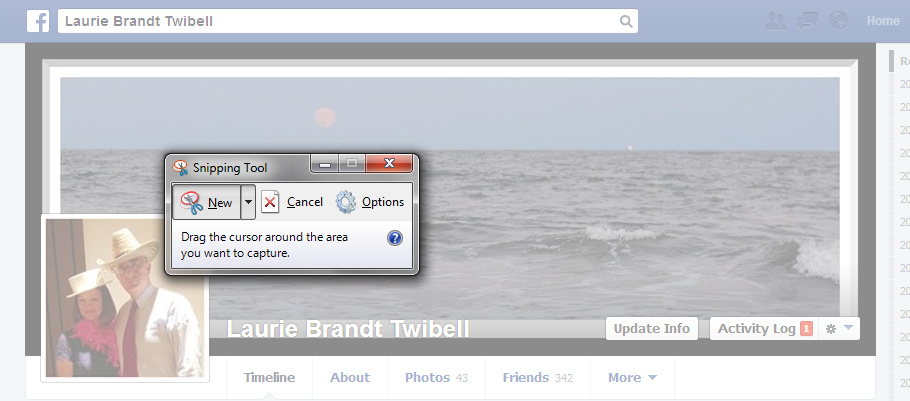 1. Using the Snipping Tool, cut the exact shape of the cover photo on FB and paste it onto a blank page in Artisan. Now you have a template to work with. In case you don’t want to use the Snipping Tool, you can cheat by entering these dimensions in the properties section: personal or page cover photo is 8.5 x 3.125, a group cover photo is 8 x 2.5. Keep in mind the little box in the lower left which is going to block out part of your photo!